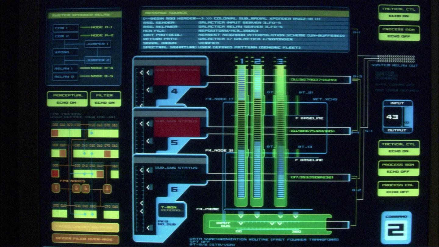 Several times in this episode, comm systems monitors on